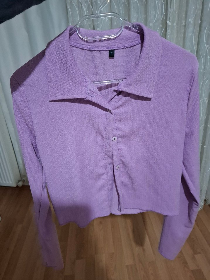 Mor keten gömlek, düğmeli ve uzun kolludur. Salaş kesimi ve midi boyuyla günlük rahat ve şık bir görünüm sunar. Pastel tonlarda, desensizdir.