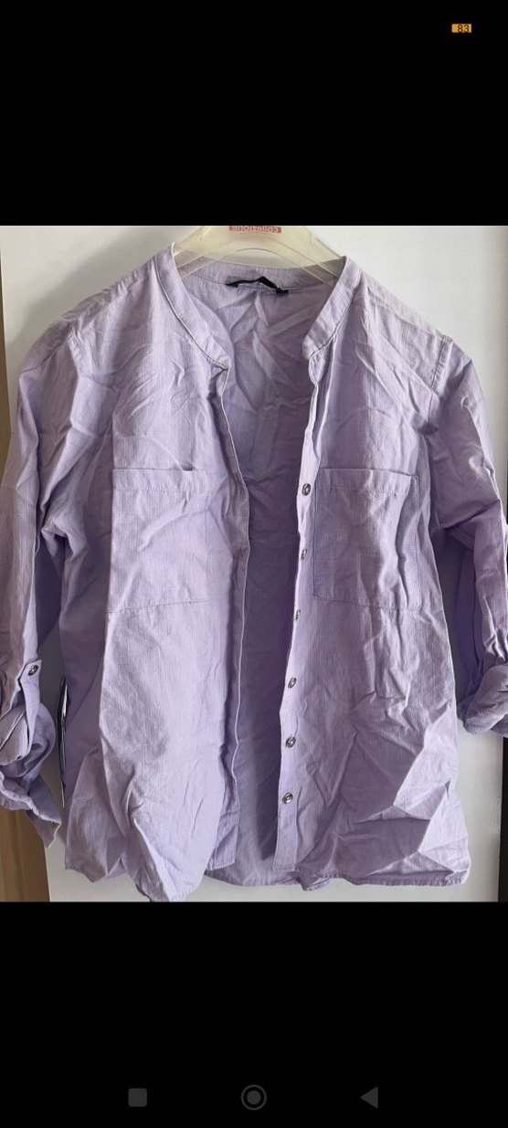 Düğmeli, yakalı, uzun kollu ve normal midi boyda mor keten kumaştan yapılmış bol kesim gömlek. Günlük rahat stil için uygundur.