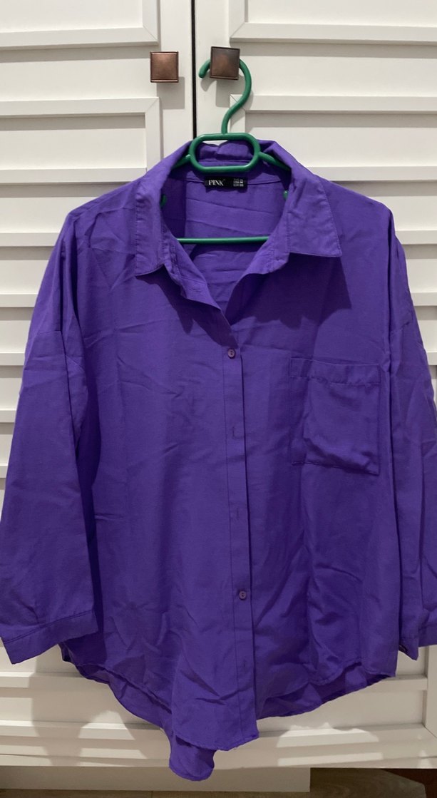 Mor renkte, keten kumaştan, uzun kollu ve düğmeli kadın gömleği. Salaş kesim ve normal midi boy ile günlük kullanıma uygundur. Minimalist sokak stiline uygundur.