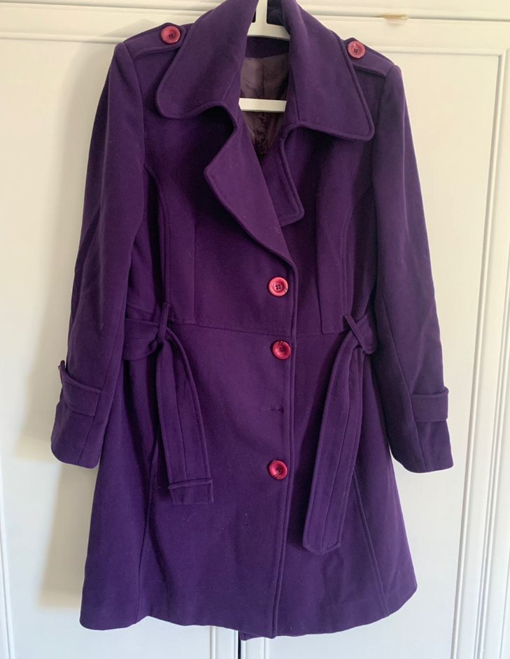 Mor renkli, kırmızı düğmeli ve kemerli kadın kaban. Geniş yakalı, uzun kollu ve omuzda düğme detaylı. İç astarı sökük 1 düğme eksiği var