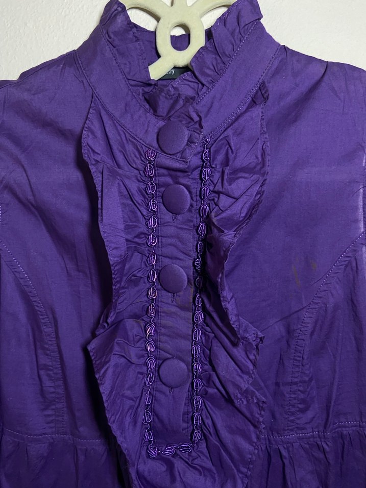 Mor renkli, parlak keten kumaştan, düğmeli ve nakışlı vintage bluz
