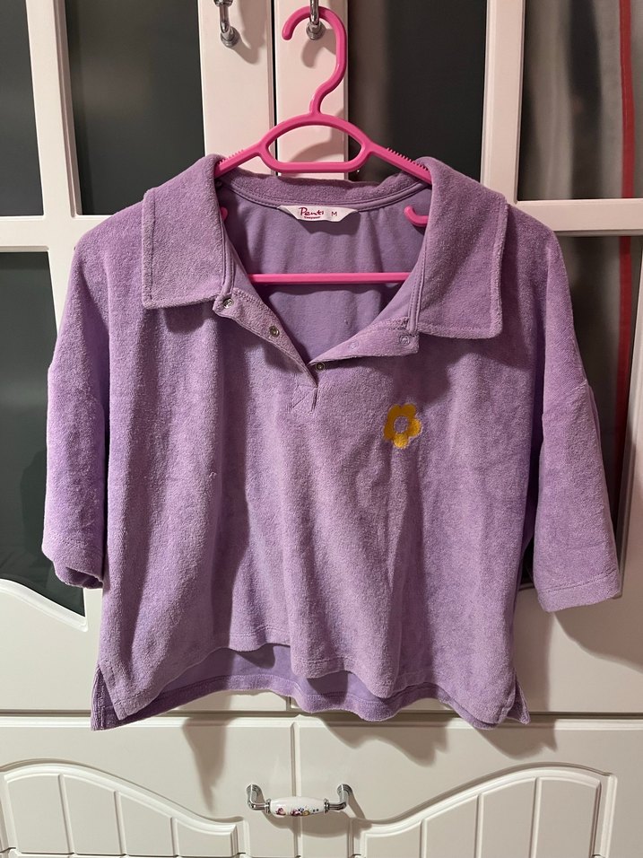 Mor renkte, düğmeli yakalı ve kısa kollu, bol kesim tişört. Üzerinde küçük çiçek baskısı bulunur. Yumuşak ve sıcak kumaştan üretilmiştir.