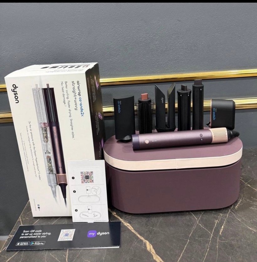 Mor Dyson saç şekillendirici seti, çeşitli şekillendirme başlıkları ve uyumlu saklama kutusuyla birlikte gelir. ♀️