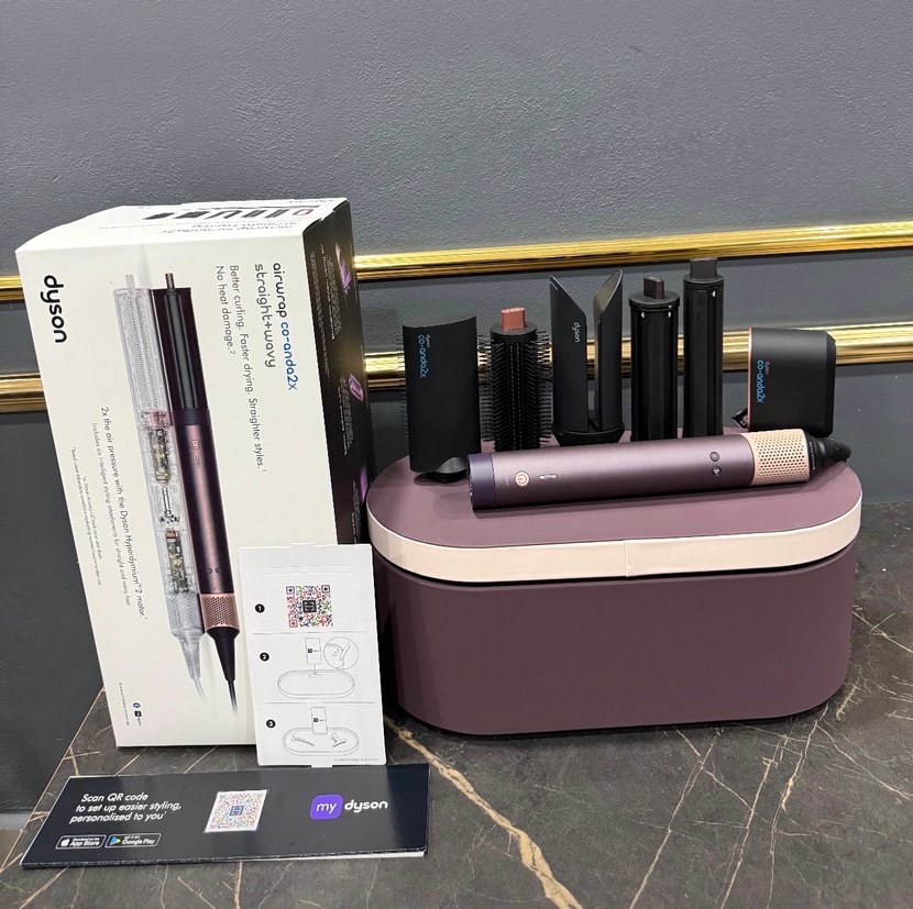 Koyu mor renkli Dyson saç şekillendirici set, kıvırma, düzleştirme ve kurutma için çeşitli aparatlar içerir. Saklama kutusu ile birlikte gelir. ♀️