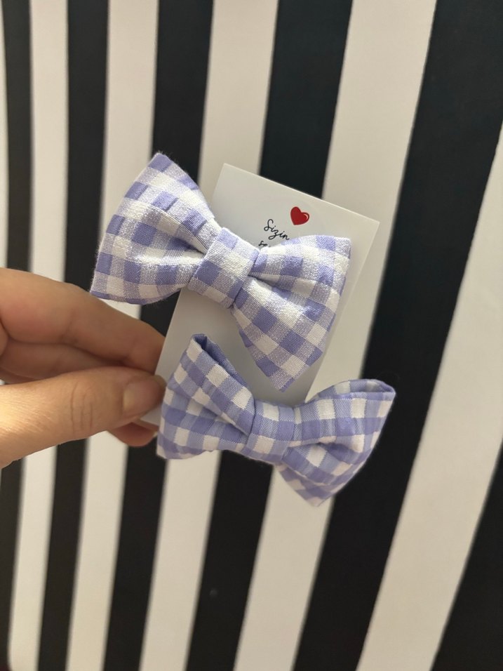 Pastel mor ekose desenli, yumuşak kumaşlı çocuk fiyonk toka, sade ve günlük sokak stili için uygundur. Timsah toka detay
