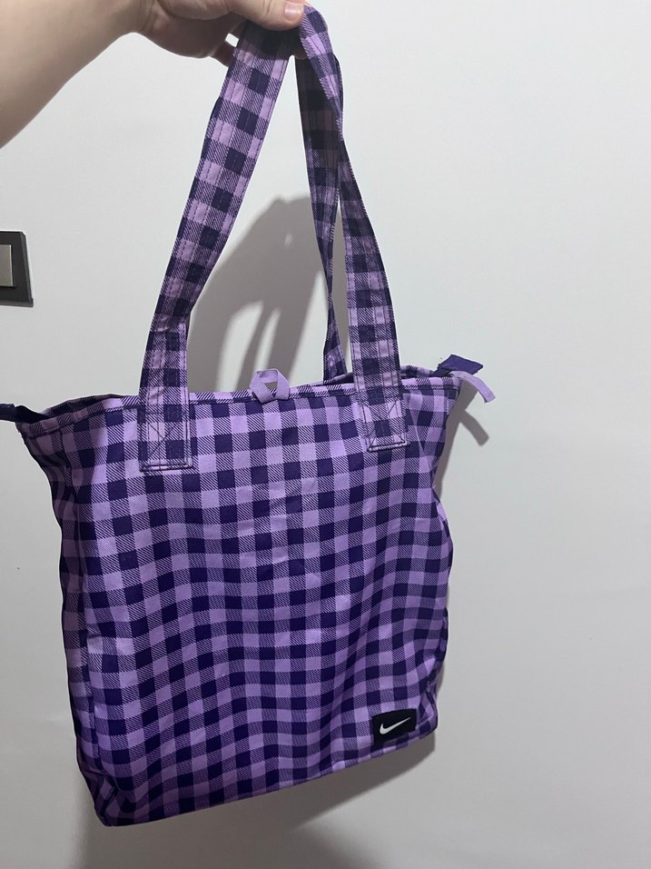 Orijinal nike çantadı..Mor ekose desenli fermuarlı kadın çanta, sentetik kumaştan üretilmiştir. Uzun sapları ve günlük kullanım için uygundur. Trend ve athleisure tarzına uygundur.
