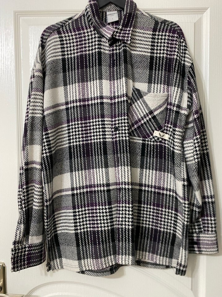Mor ekose desenli, düğmeli, uzun kollu, bol kesim kadın gömleği. Normal boyda ve rahat, günlük kullanıma uygun tekstil kumaştan.