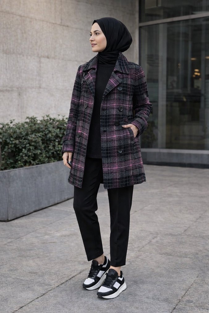 Mor ekose desenli kadın palto, kesik yaka ve uzun kolludur. Bol kesimi ve düğmeli tasarımıyla günlük kullanıma uygundur.