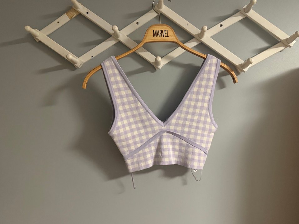 Mor ekose desenli, fitted kesim kısa crop top. V yaka ve ince askılarıyla şık bir sokak stili parçası. 1 kere giyildi hasarsız defosuz. Zara eski sezon.