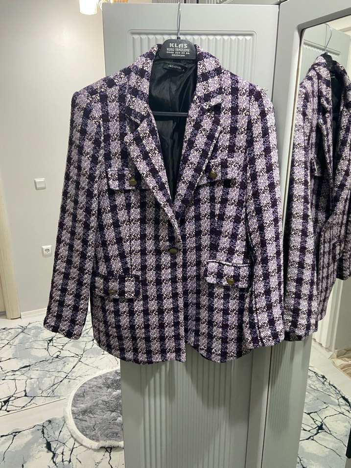 Mor ekose desenli, düğmeli kadın blazer. Notched lapel yakalı, uzun kollu, normal kesim ve sentetik kumaştan yapılmıştır. Ofis için uygundur. Tüylenmesi yok 36,38,40 beden uyumlu
