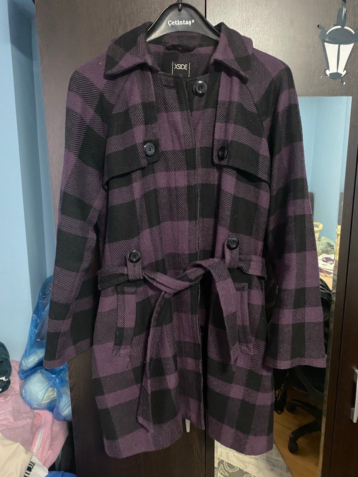 Xside marka XXL beden, Mor ekose desenli kaban, düğmeli, belden bağlamalıdır.midi boydadır, günlük rahat kullanım için uygundur.