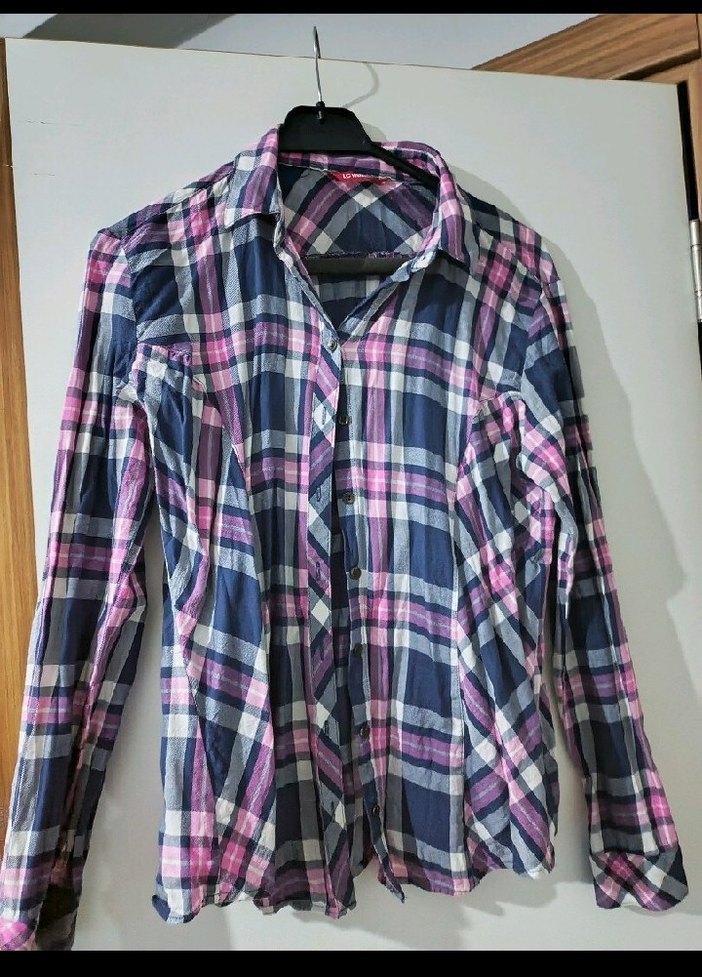 Mor ekoseli desenli, uzun kollu, düğmeli ve yakalı kadın gömleği. Normal uzunlukta ve rahat kesimdir. Sentetik kumaştan üretilmiştir.