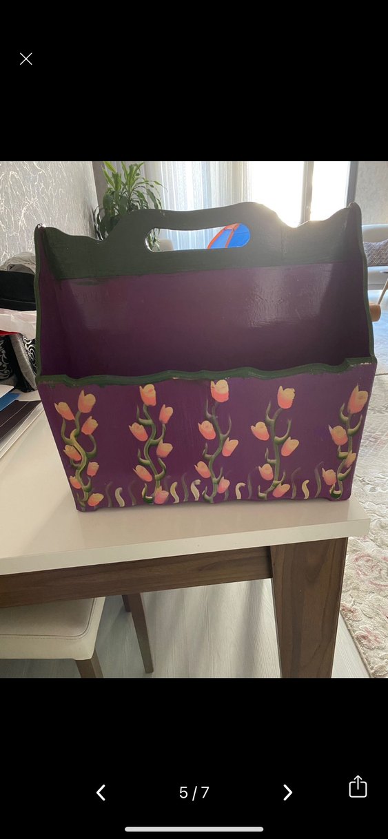 Koyu mor renkte, el boyaması çiçek desenli ve taşıma kulplu saklama sepeti. Küçük eşyalar için uygundur. #ahşapsepet #ahşapkutu #saklamakutusu #ahşapdüzenleyici