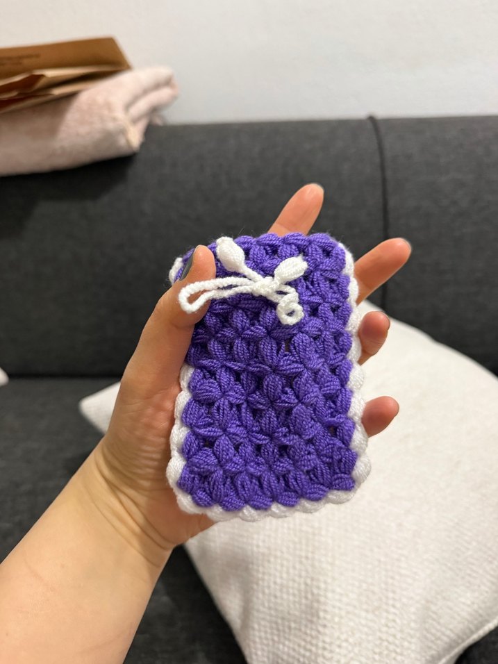 Mor renkte el örgüsü banyo süngeri, beyaz kenar süslemeli ve küçük fiyonk detaylıdır. Nazik temizlik için uygundur.