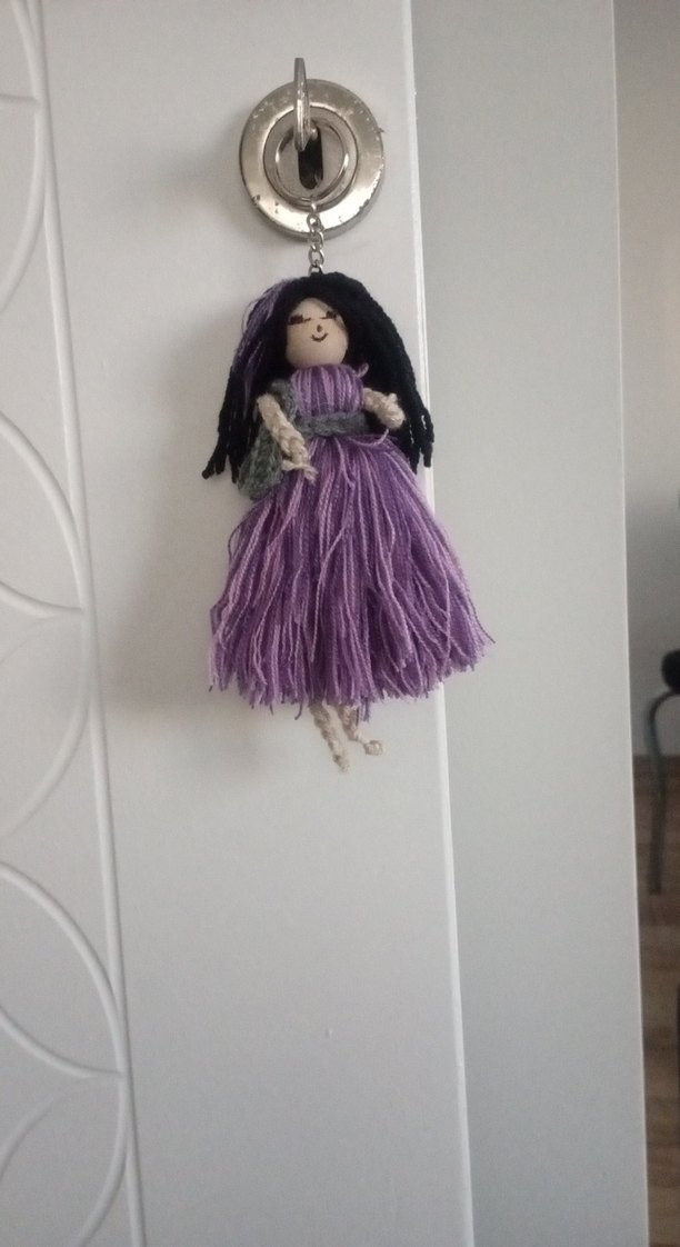 Koyu mor ipten yapılmış küçük el örgüsü bebek anahtarlık, örgü elbise ve siyah saç detaylıdır. Metal zincirle asılır.