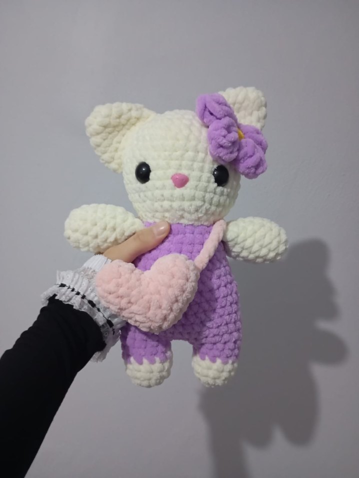 Yumuşak, el yapımı peluş kedi oyuncak, mor kıyafet ve kalp şeklinde pembe çanta ile. Kulakta mor fiyonk ve siyah gözler bulunur.