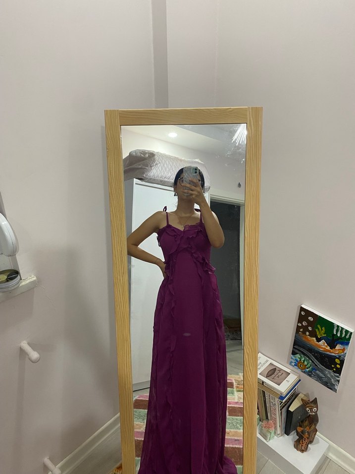 uzun elbise. fuşya ve mor arasında bir renk. sadece 1 kez giyildi, sorunsuz.