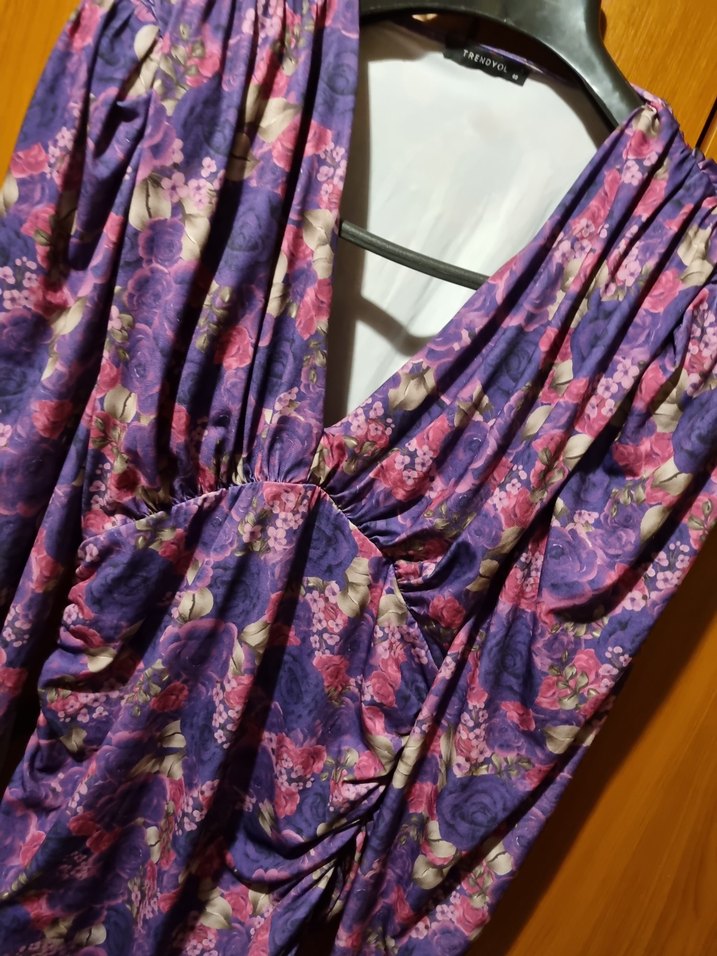 mor çiçekli vucudu zayıf ve zarif gösteren elbisem yeni ve etiketlidi 42,44,beden uyumlu