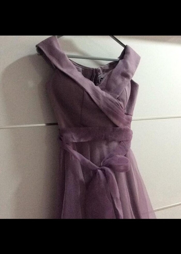 Mor elbise a kesim tüllü, omuzları kayıkyaka