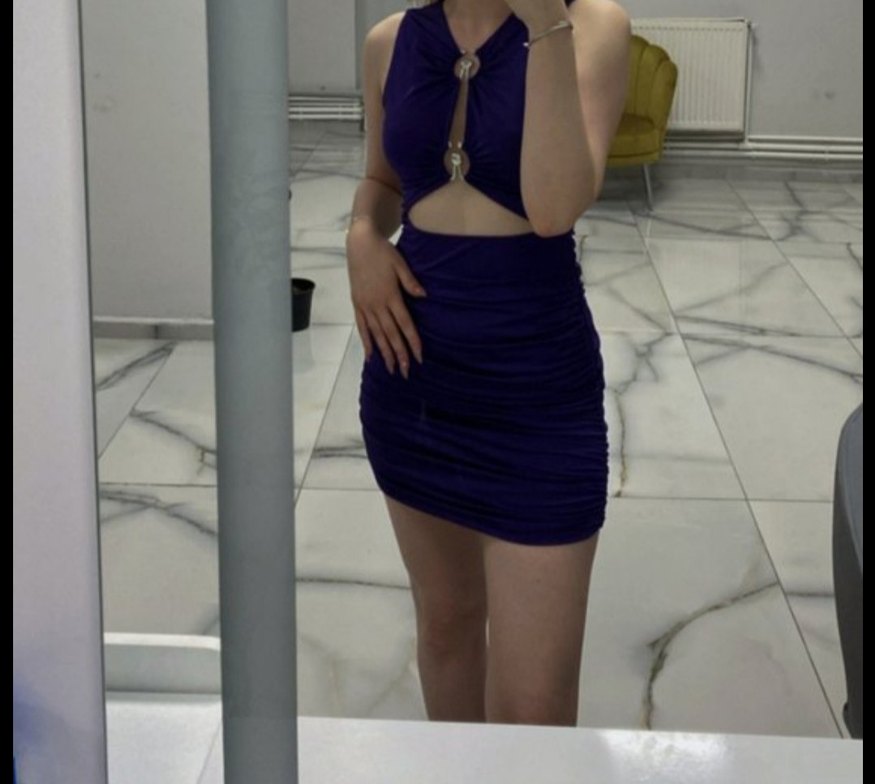Mor, drapeli ve saten dokulu mini elbise. V yakalı, askılı ve belde kesim detayı bulunan, cesur ve gösterişli tarzda.boyu ayarlanabilir.