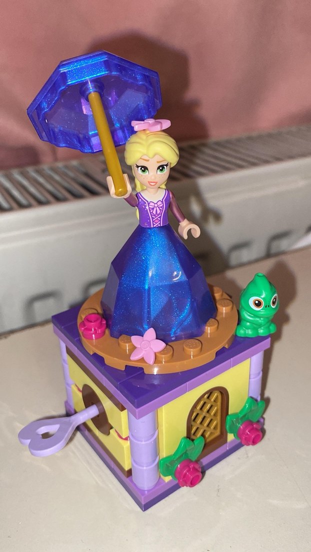 Mor Lego şeffaf şemsiye tutan prenses figürü ve küçük yeşil hayvan.