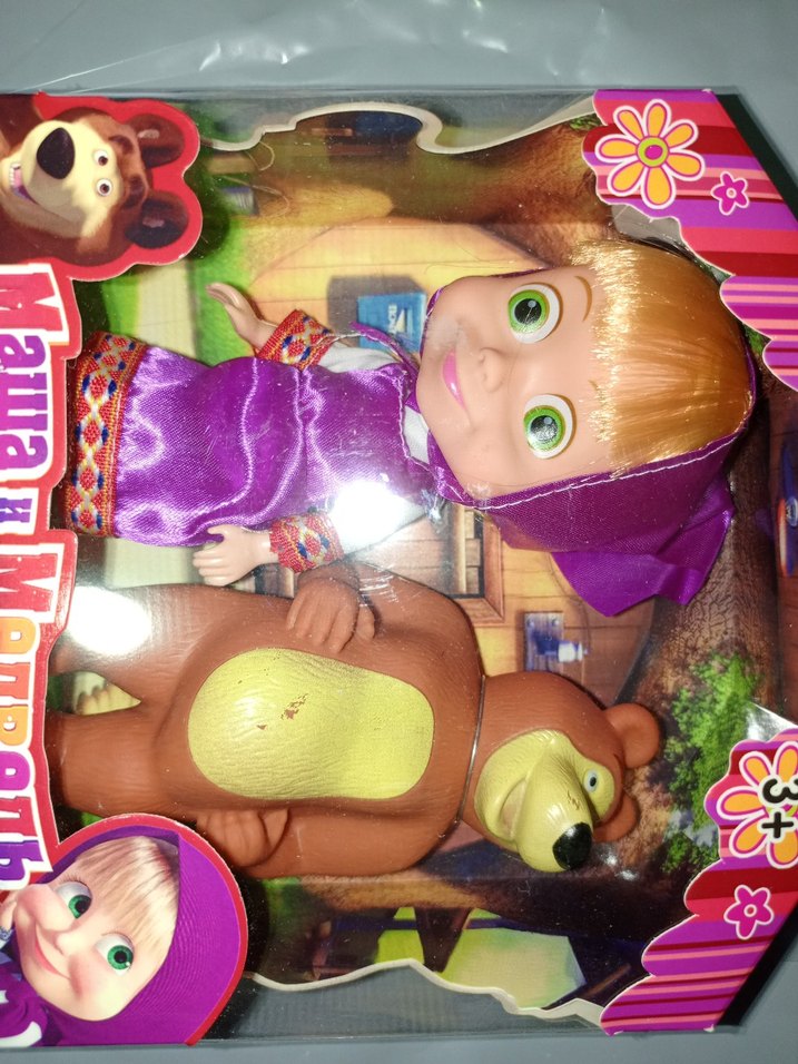 Mor elbiseli kız bebek ve ayı figüründen oluşan renkli oyuncak seti, çiçek desenli kutuda sunulmaktadır.