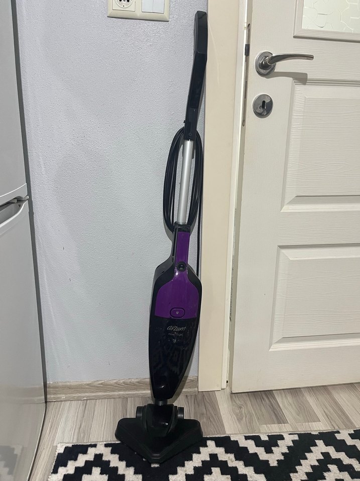 Mor renkli elektrikli süpürge, ince tasarıma sahip uzun sapı ve kolay saklama için sarılmış kablosu bulunur. Zemin temizliği için uygundur.