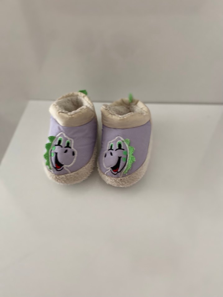 Mor renkli, yumuşak astarlı ve kolay giyilebilen cırt cırtlı erkek çocuk sıcak terlikleri, renkli dinozor desenli.