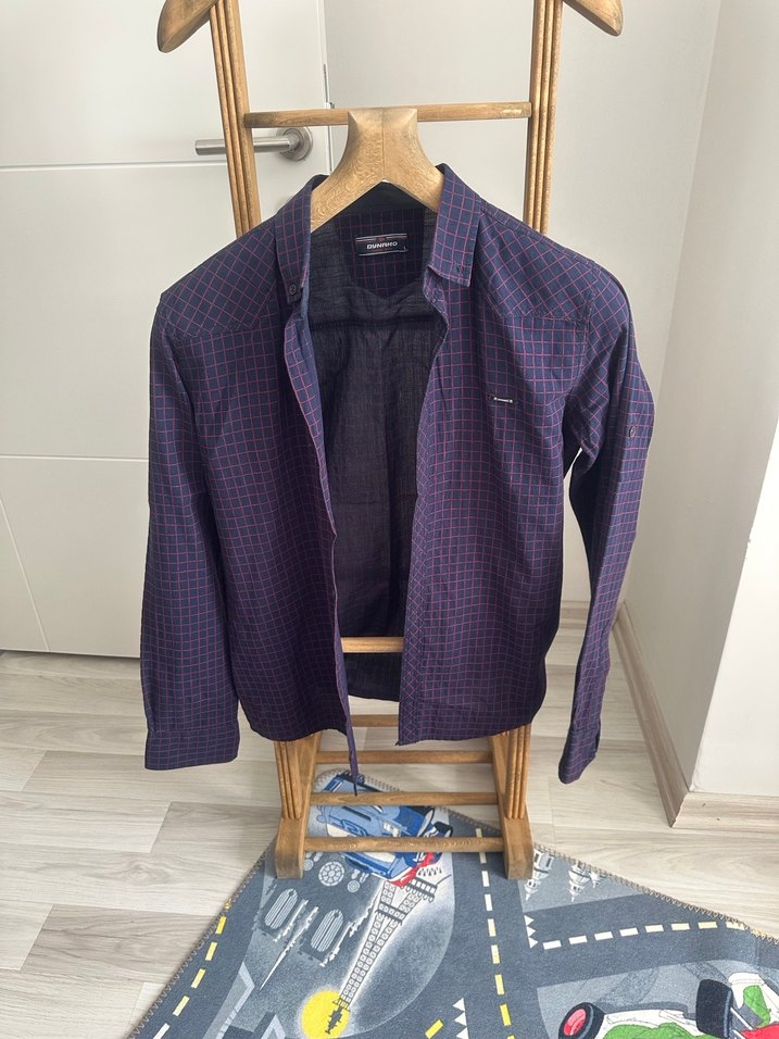 Mor renkte, uzun kollu ve notlu yaka detaylı erkek gömleği. Düğmeli ve düz kesim, rahat sokak stili için uygun.