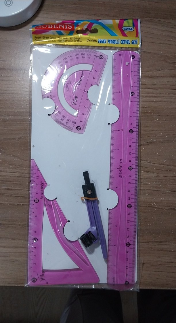 Mor renkli, esnek cetvel, gönye, açıölçer ve pergelli çizim seti içerir.