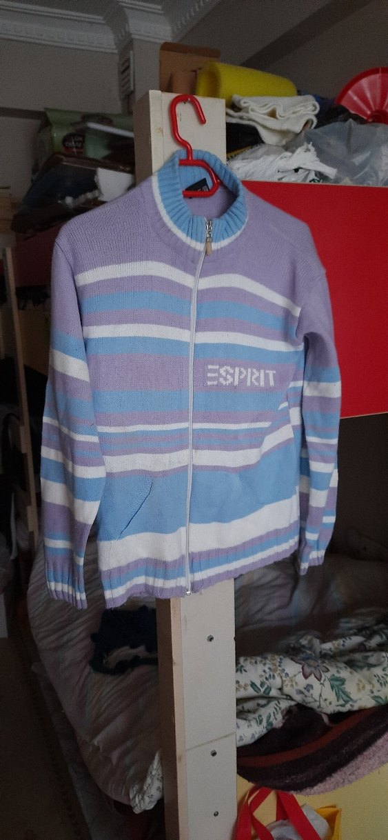 Mor pastel tonlarında, çizgili, yumuşak ve sıcak triko hırkası. Uzun kollu, bisiklet yaka ve fermuarlı, Esprit markalı, günlük kullanıma uygun.