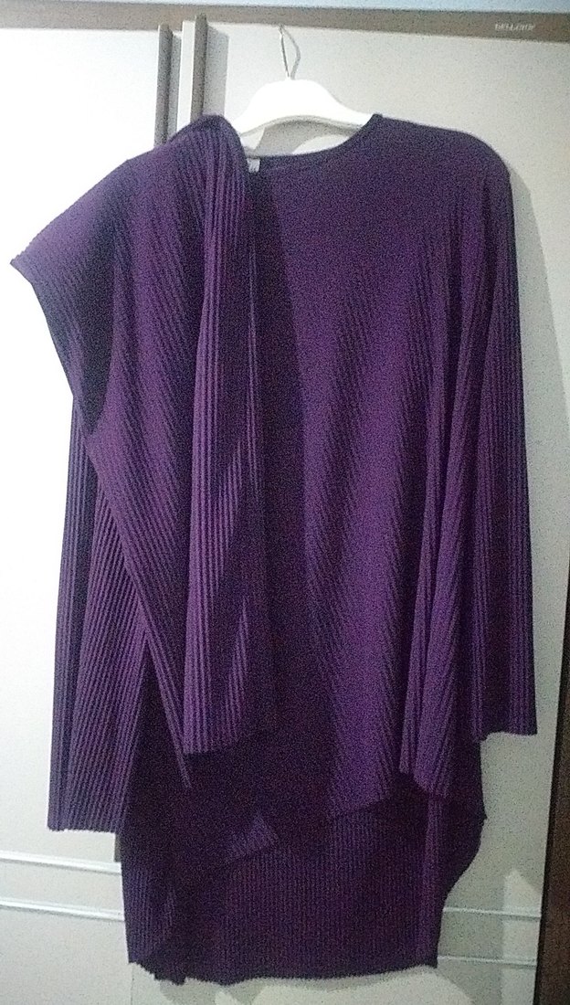 Mor renkli, pileli sentetik kumaştan yapılmış, bol kesim uzun kollu Yuvarlak yakalı, çok güzel takım malıda güzel