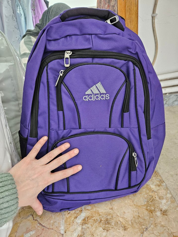 Koyu mor renkli, fermuarlı çoklu bölmeli Adidas kadın sırt çantası, yumuşak ve tüylü kumaştan, spor ve sokak giyim tarzına uygun.