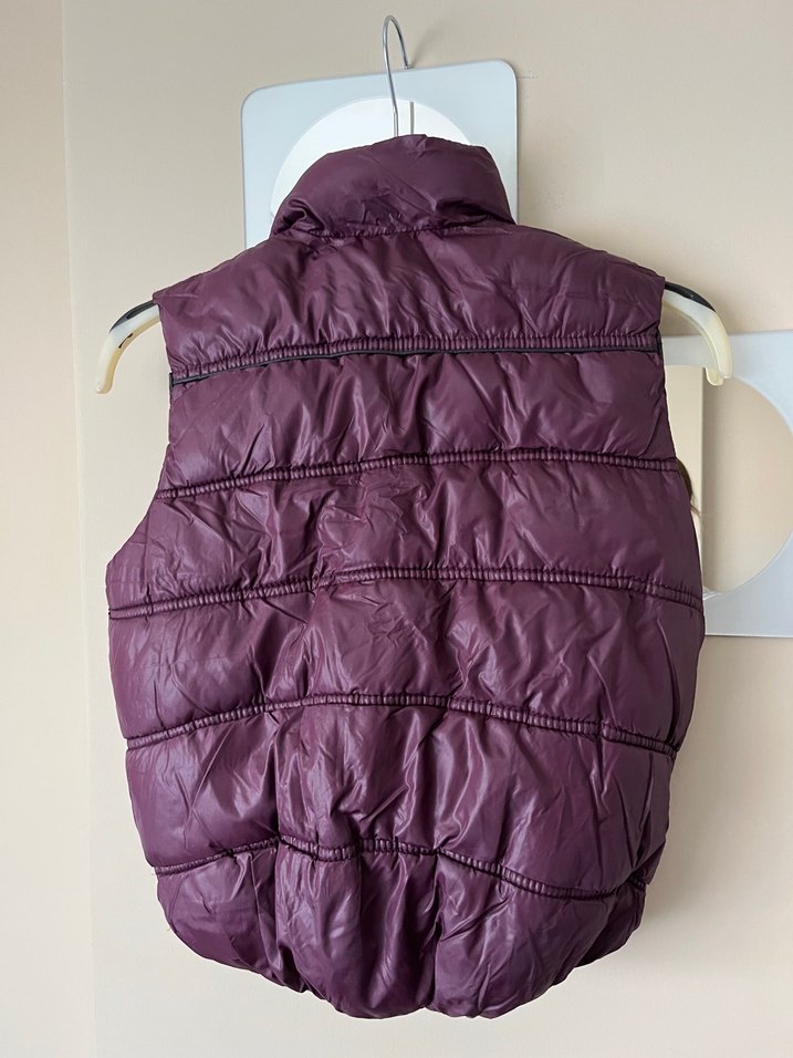 Fermuarlı, yüksek yakalı, mor şişme çocuk yeleği. Sentetik kumaştan, kolsuz ve normal midi boyda, günlük kullanıma uygundur. Zara marka az giyildi