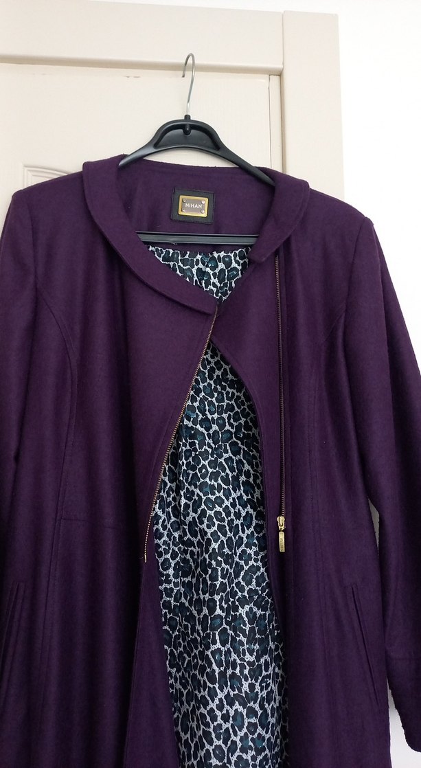 Mor renkli, uzun ve bol kesim kabanı. Fermuarlı önü, uzun kollu ve rahat, sıcak kumaştan üretilmiştir. Sokak stiliyle uyumludur. göğüs ölcüsü 51cm boyu 114cm ürün etek ucu asimetrik uzunlu kısalı,