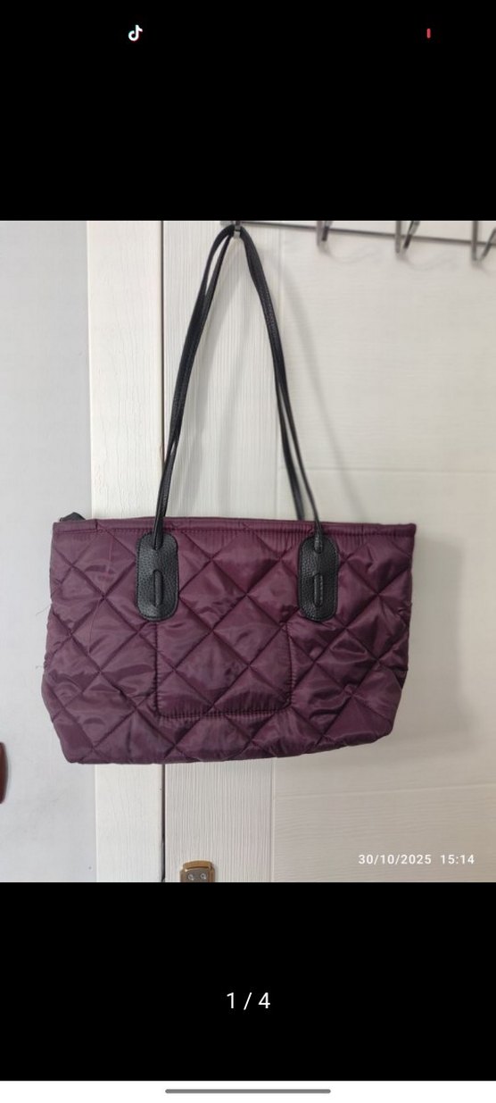 Koyu mor renkte, fermuarlı, uzun siyah saplı kadın çantası. Sentetik kumaştan, minimalist ve sokak tarzına uygun, günlük kullanıma uygun.