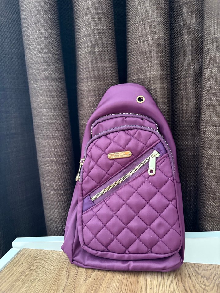 Yumuşak sentetik kumaştan mor çapraz çanta, fermuarlı ön cep ve minimalist tasarımla günlük sokak stili için uygun.
