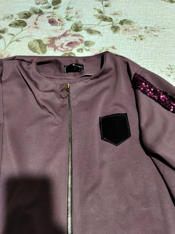Mor renkli, fermuarlı ve uzun kollu bu kadın ceket, yuvarlak yaka ve baskılı desenle günlük sokak stili için uygundur. Kollarda payet detayları vardır.