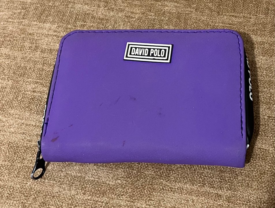 Ön tarafında birkaç lekesi var giderilir kalıcı değildir. David Polo markalı mor kadın cüzdanı, fermuarlı ve baskılı tasarıma sahip, yumuşak ve sıcak dokulu kumaştan yapılmıştır, günlük kullanıma uygundur.