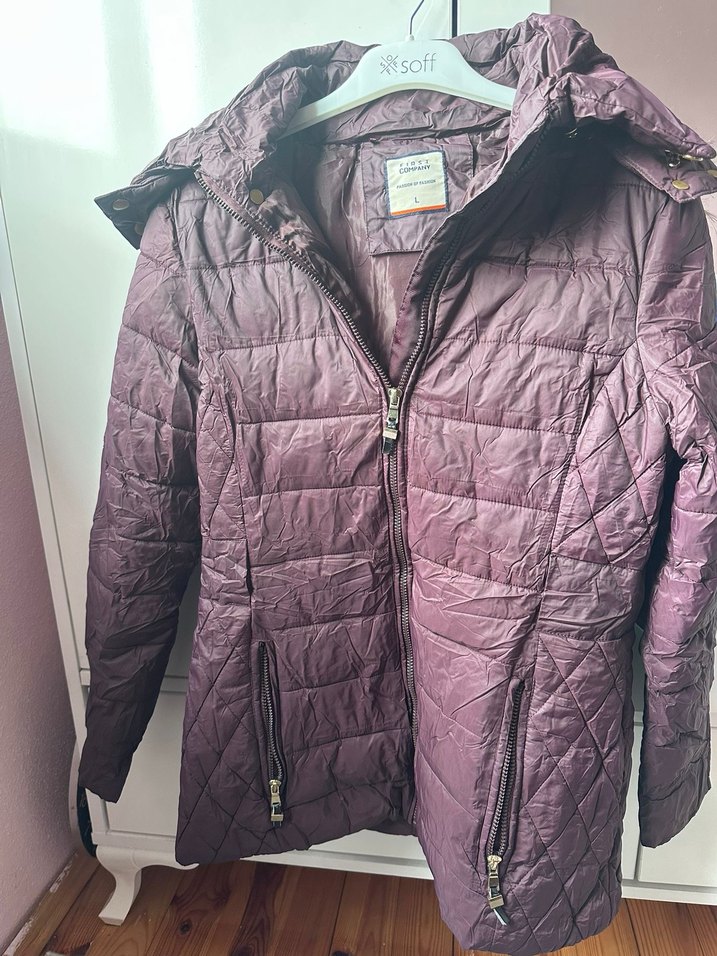 Fermuarlı cepleri ve kesik yaka detayıyla mor, normal uzunlukta, dar kesim kadın kışlık mont. Rahat sentetik kumaştan ve sokak stili için uygun.