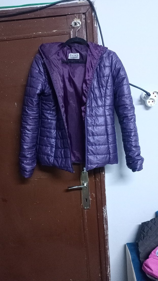 Mor fermuarlı, uzun kollu, sentetik kumaştan yapılmış, rahat kesimli, günlük kullanıma uygun kadın mont.