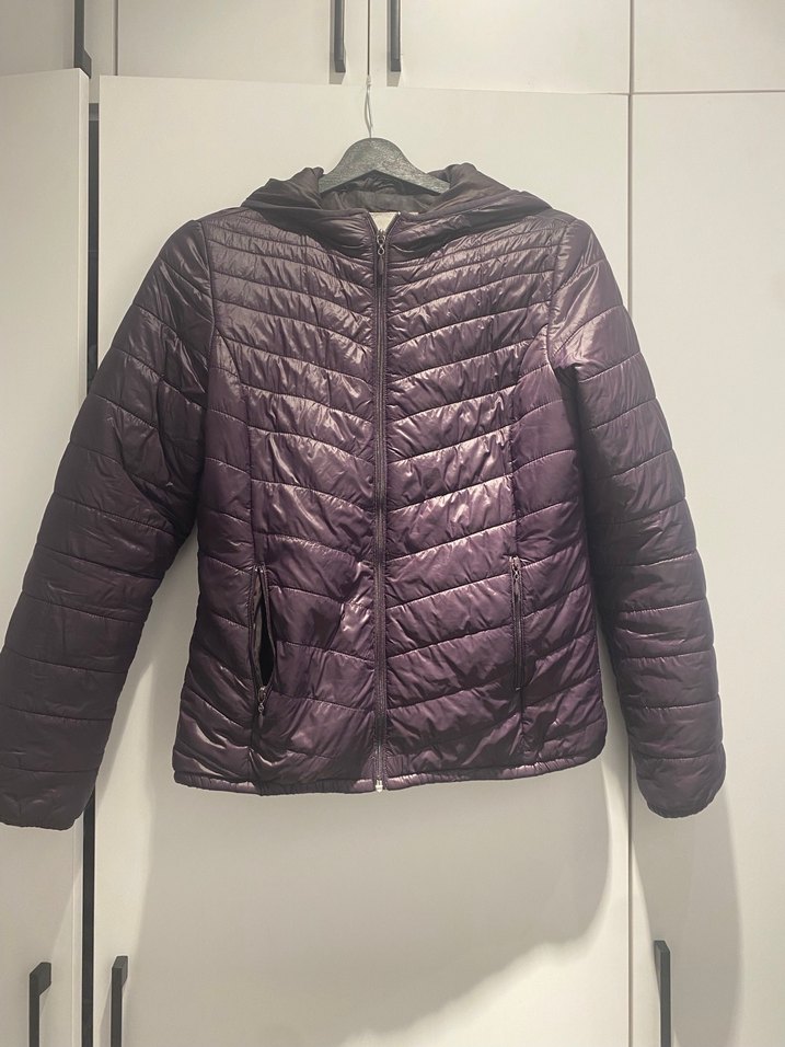 Mor renkli, fermuarlı ve uzun kollu kadın mont. Sentetik kumaştan yapılmış, midi boy ve düz desensizdir. Sokak modasına uygun, rahat bir tasarıma sahiptir.