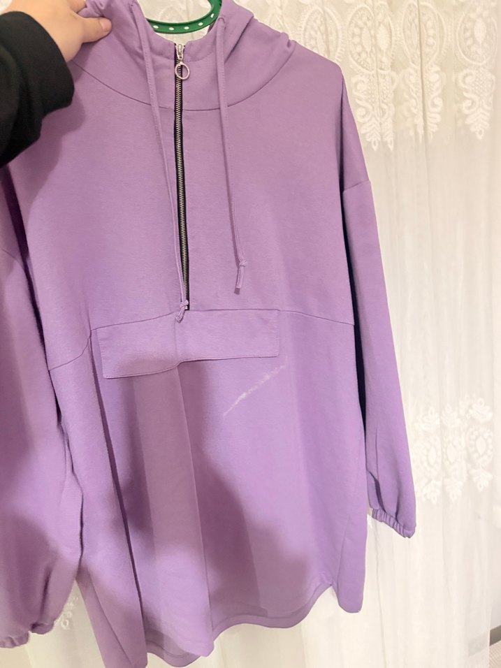 Mor renk, fermuarlı ve uzun kollu, bol kesim sweatshirt. Yumuşak ve sıcak kumaştan üretilmiştir, günlük rahat stil için uygundur.