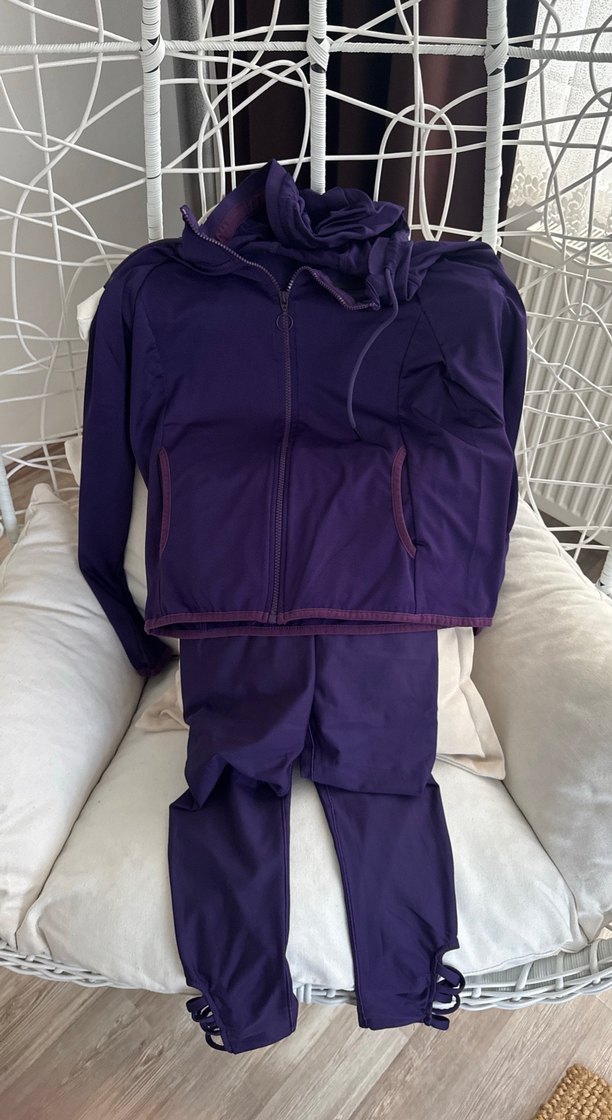 Mor, fermuarlı, yüksek yakalı ve uzun kollu kadın eşofman takımı. Yumuşak ve sıcak kumaştan, midi boyda, günlük kullanıma uygun sade tasarım.