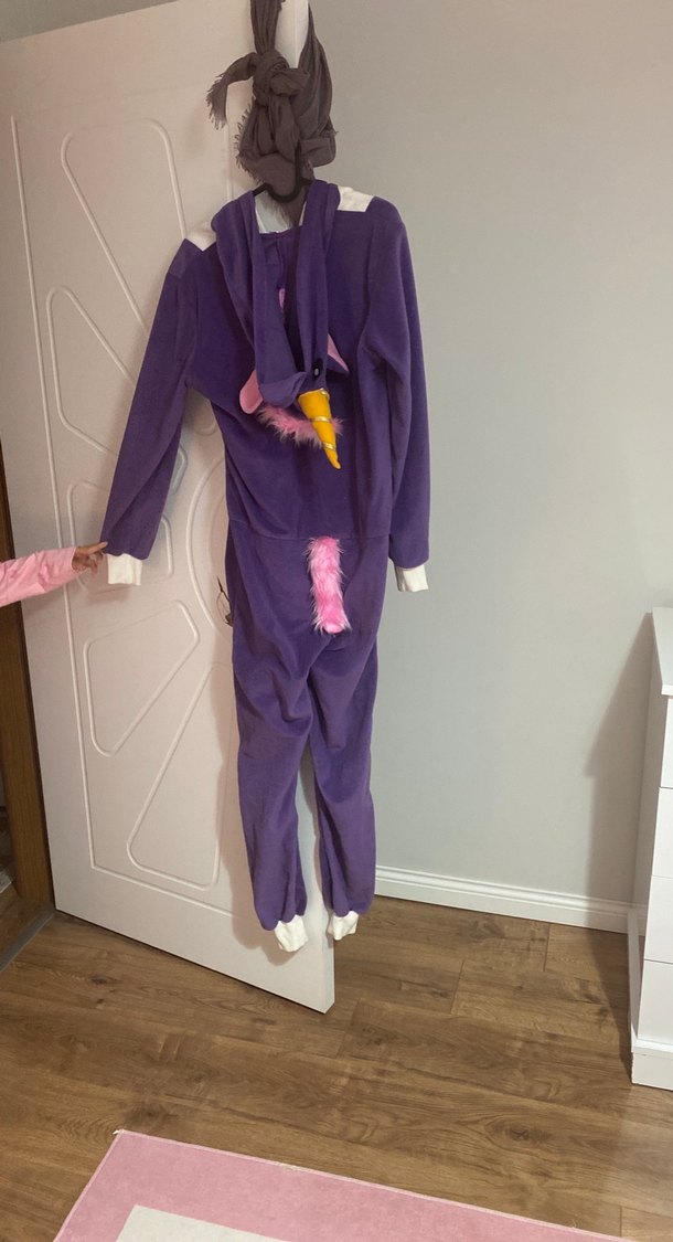 Mor renkte, fermuarlı, uzun kollu, notched lapel yakalı kız çocuk polar pijama. Beyaz manşetler ve kapüşonda pembe detaylar bulunur.