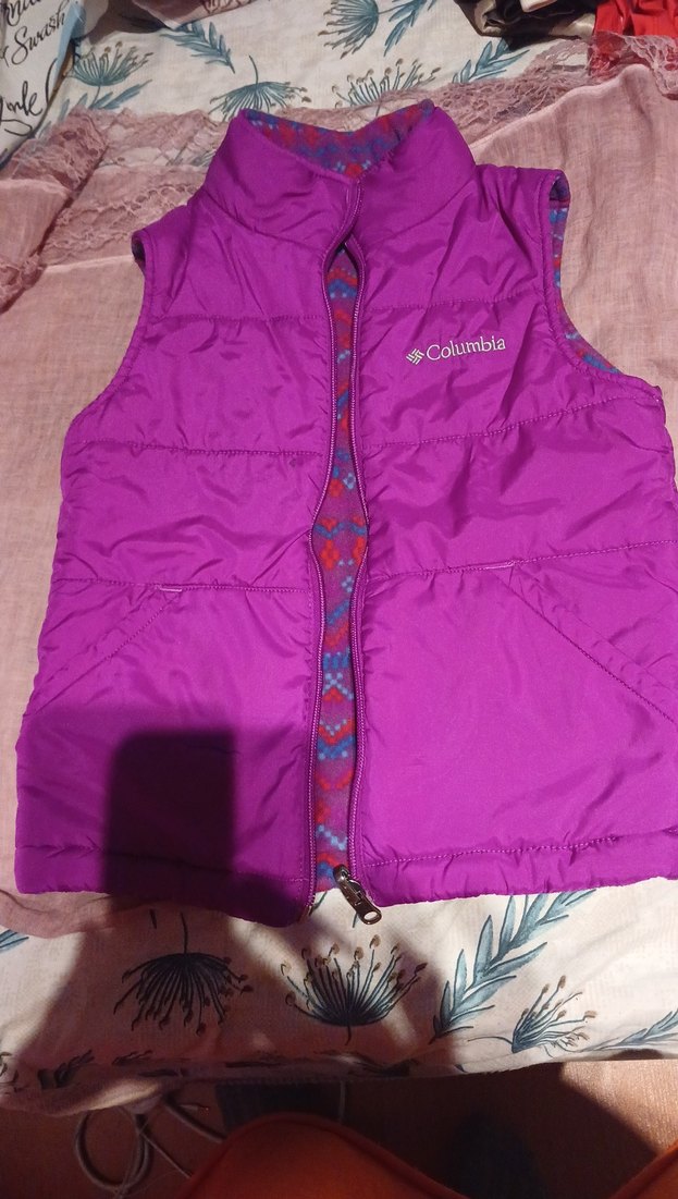 Mor renkli, fermuarlı ve kolsuz kız yeleği. İnce kesimli, straplez yakalı ve desen içermeyen, yumuşak ve sıcak kumaştan yapılmıştır. Columbia markası.