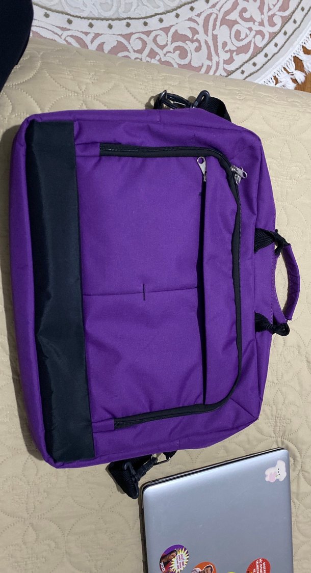 Koyu mor renkte, fermuarlı bölmeleri olan, sentetik kumaştan yapılmış kadın laptop çantası. Minimalist, desen içermeyen sade tasarımı günlük sokak stiline uygundur.