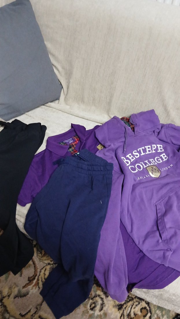 Mor renk, bol kesim kız sweatshirtü, yuvarlak kapsonlu ve mor yarım kollu tısort 2 tane esofman altı