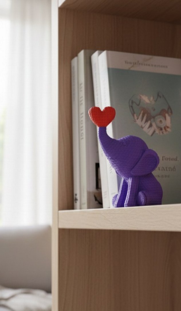 Renkli mor fil figürü, hortumunda kırmızı kalp tutuyor,