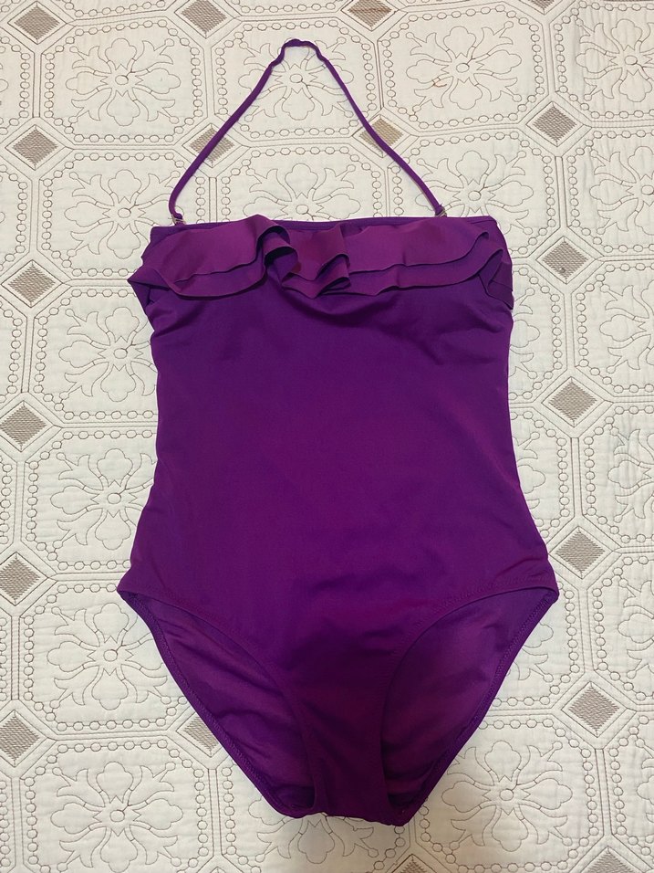 Mor renkte, askılı ve fırfırlı detaylı, vücuda oturan kadın mayo. Hiç bir sıkıntısı yok 1 defa falan giyilmiştir.